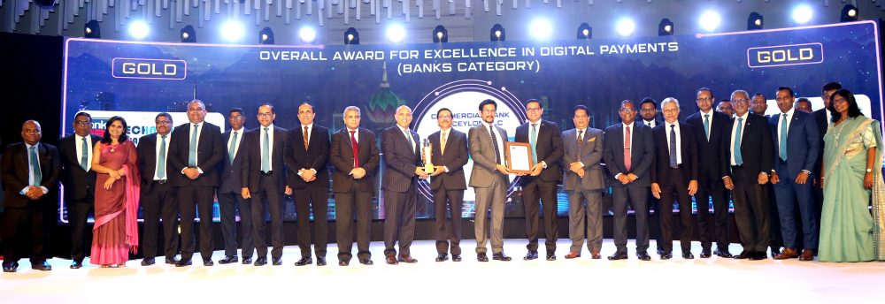 Photo caption: Senior representatives from Commercial Bank, led by Mr. Sharhan Muhseen, Chairman; Mr. Raja Senanayake, Deputy Chairman; and Mr. Sanath Manatunge, Managing Director/CEO, receiving the Overall Gold Award for Excellence in Digital Payments (Banks).
