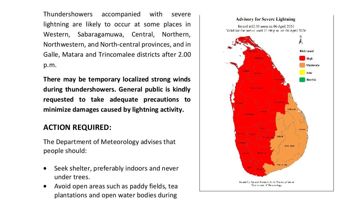 Sri Lanka’s Meteorology Department has issued a warning regarding the likelihood of thundershowers accompanied by intense lightning in several regions, including the Western, Sabaragamuwa, Central, Northern, Northwestern, and North-Central provinces, as well as in the districts of Galle, Matara, and Trincomalee, starting from 2 PM.