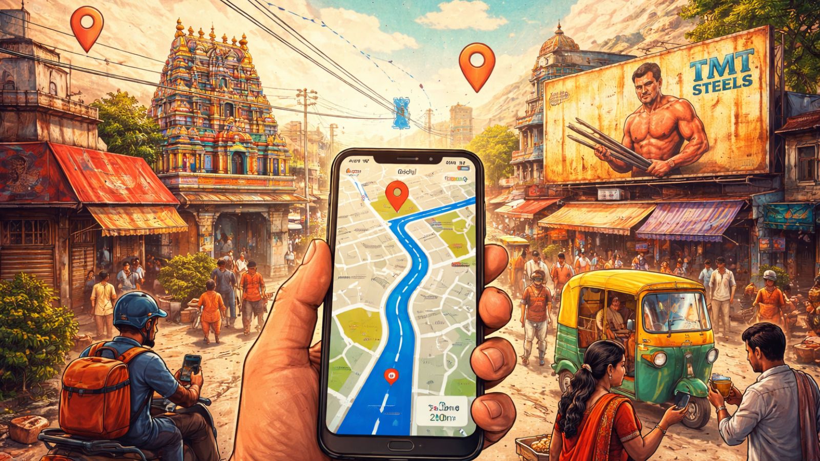 “Madam, location galat dikha raha hai,” a driver might say, translating to, “Ma’am, the location is wrong.” In these moments, I revert to traditional navigation methods: “Bhaiya, Gurudwara dikh raha hai? Bas wahi ruk jao. Main bahar aa rahi hoon,” asking them to stop at a nearby Gurudwara. It highlights a return to a world where community landmarks—the temple, mosque, or local chai shop—become the vital points of reference, much like my TMT Steels mural did in my childhood.