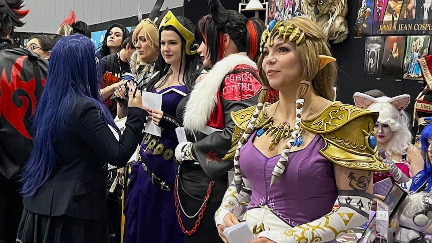 At the heart of a bustling cosplay tournament in Melbourne, a character known as Miss Twisted, an elf princess, leads an ensemble of warriors, sorceresses, and other enchanting figures.