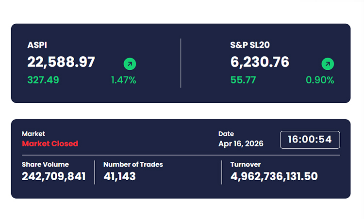 The All Share Price Index (ASPI) surged by 327.49 points, concluding the day at 22,588.97, which translates to a 1.47% rise from the prior trading session.