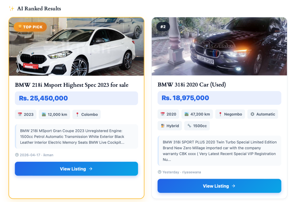 LESI Search moves beyond traditional listing platforms by using AI to aggregate vehicle listings from multiple Sri Lankan marketplaces and analyze critical factors such as price, condition, features, and ownership history. It then evaluates and ranks the most suitable options, allowing users to make smarter, faster, and more informed decisions when purchasing a vehicle.