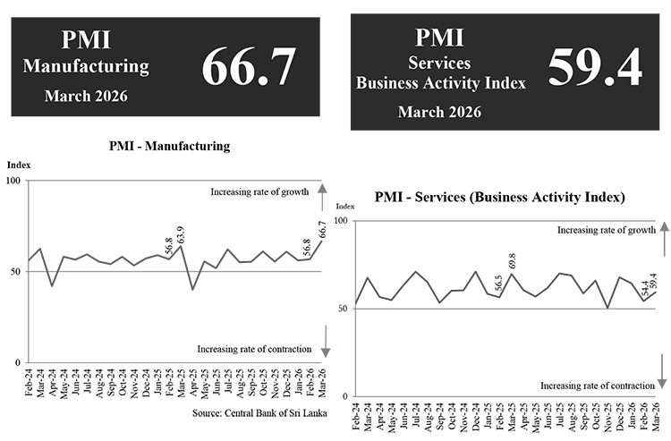 In March 2026, the Purchasing Managers’ Indices (PMIs) reflect growth in both the Manufacturing and Services sectors in Sri Lanka.